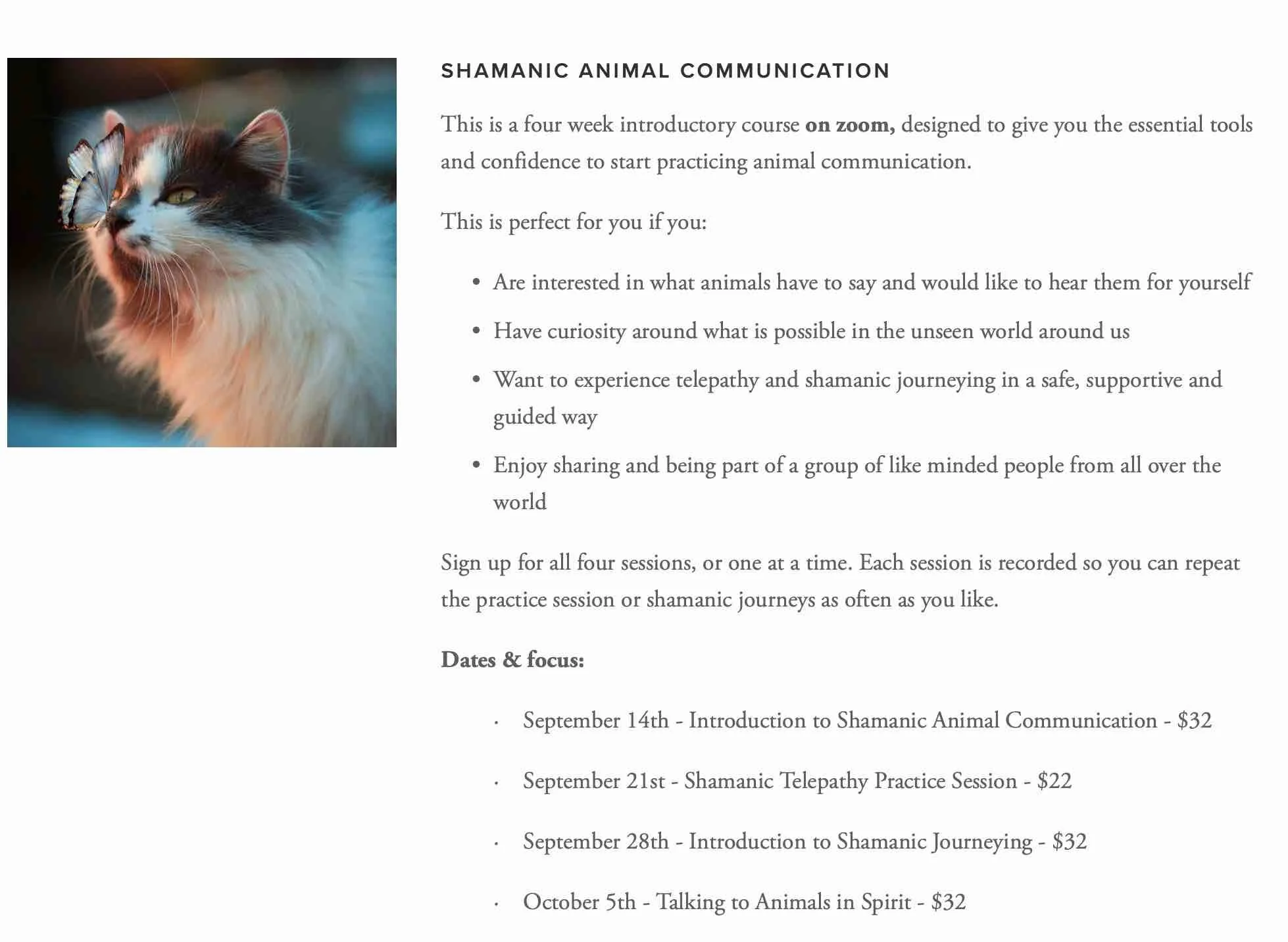 For years I've said that I want to empower others in this way and it's finally time to make it formal with a four week modular workshop. Through these 4 group sessions I will teach and empower you with information, tools and most importantly, confidence to start communicating with animals yourself.